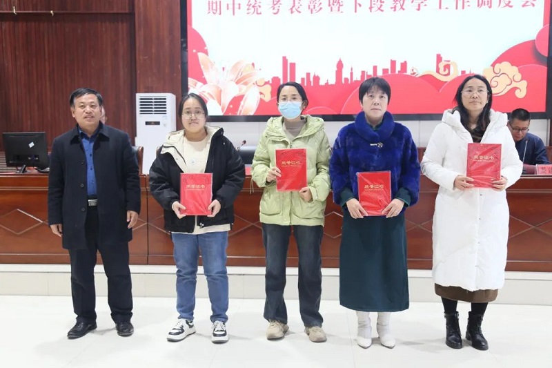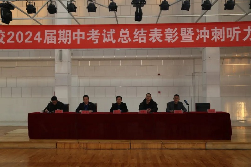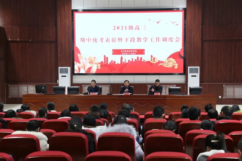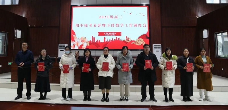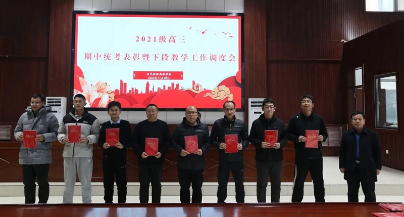 本次表彰大会共分两个阶段举行,第一阶段举行了期中统考教师表彰暨下段教学工作调度会。会议由高三年级主任王涛主持,党支部书记、校长梁本江,副校长娄建东及高三全体教师参加。