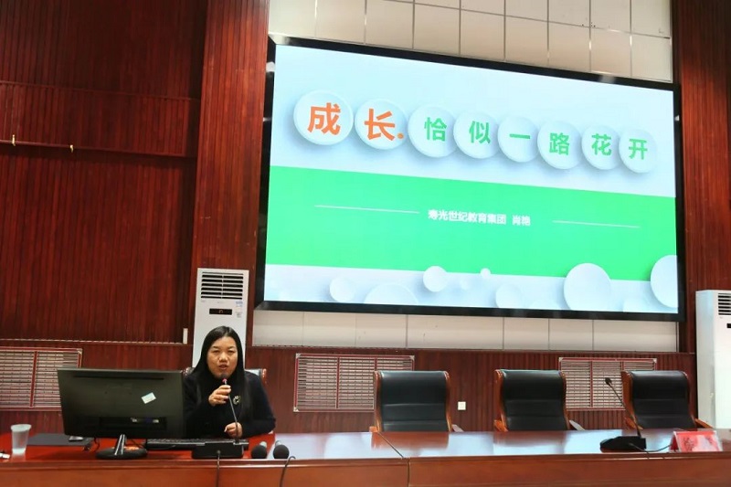 最后,由寿光世纪教育集团肖艳校长做下午第二场宣讲。肖艳校长的演讲主题是《成长恰似一路花开》。她以26个字母的互动故事为引,结合自身教育经历,与大家分享了教师成长的十个锦囊:态度、认识自己、目标、参与、引领、坚持、反思、读书、写作、研究。肖艳校长说:“人生没有地图,我们一路走,一路自我修炼,一路追逐梦想,‘心’香载‘物’,幸福未央。”